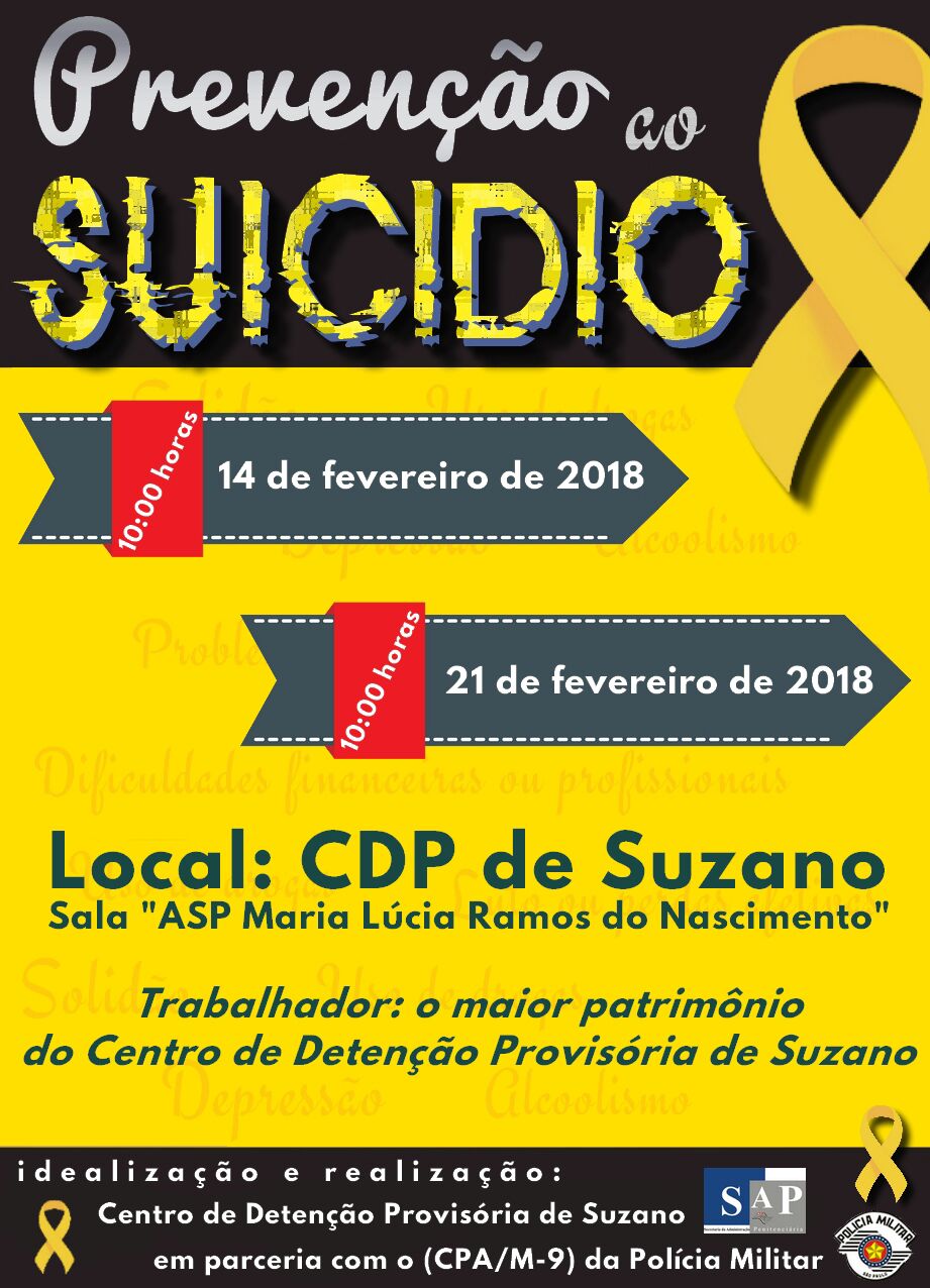 O evento “Prevenção ao Suicídio”, sob o mote “Trabalhador: o maior patrimônio do CDP de Suzano”, valorizando a vida do servidor, já que muitos escolhem acabar com suas dores emocionais por meio do suicídio, essa triste trágica realidade assistida pelo trabalhador penitenciário, conta com a  palestrante, psicóloga da Polícia Militar, Cabo Lira.