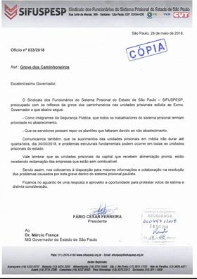 A Diretoria do SIFUSPESP protocolou na Casa Civil do Governo do Estado um ofício direcionado ao governador do estado, Márcio França (PSB), na tarde desta segunda-feira (28/05), a respeito da Greve dos Caminhoneiros, devido aos reflexos que a mesma tratá às unidades prisionais.