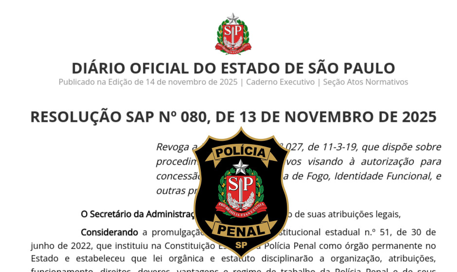 Hoje foi publicada a Resolução SAP N° 080/2025 que transfere a competência de regulamentação do porte de armas do Secretário da SAP para o Diretor Geral da Polícia Penal.