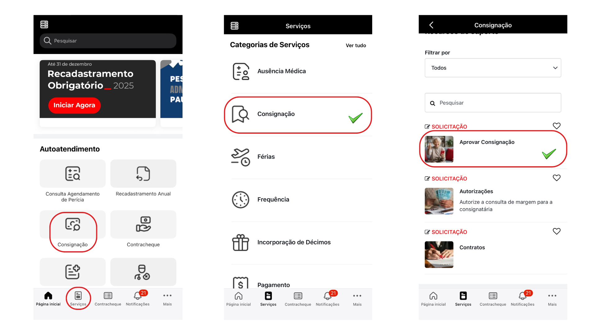 - Na tela inicial do SOU.GOV.SP, clique em “Consignação” no item de “Autoatendimento” ou em “Serviços”, depois “Consignação” e selecione o serviço “Aprovar Consignação”