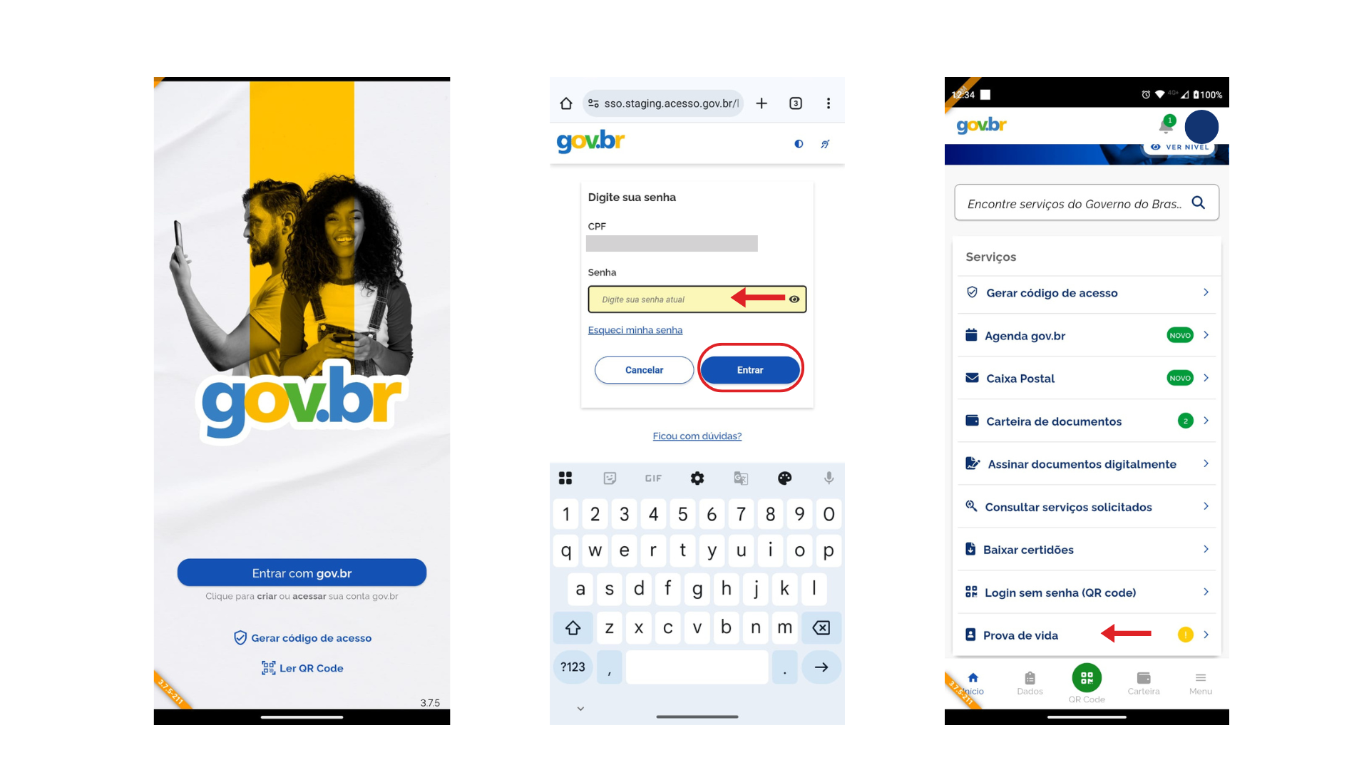 - Você será direcionado ao aplicativo do Gov.br. Acesse com suas credenciais normalmente. Na tela inicial, vá em "Prova de Vida”.