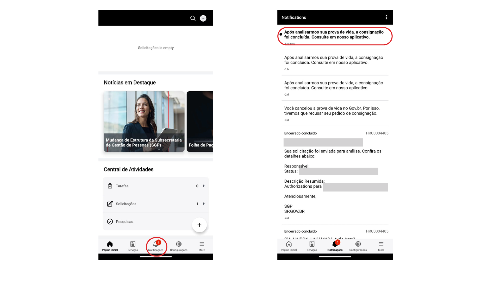 - Após conclusão da Prova de Vida, volte ao aplicativo SOU.SP e vá em “Notificações”. Nas notificações, consta a aprovação da sua consignação.