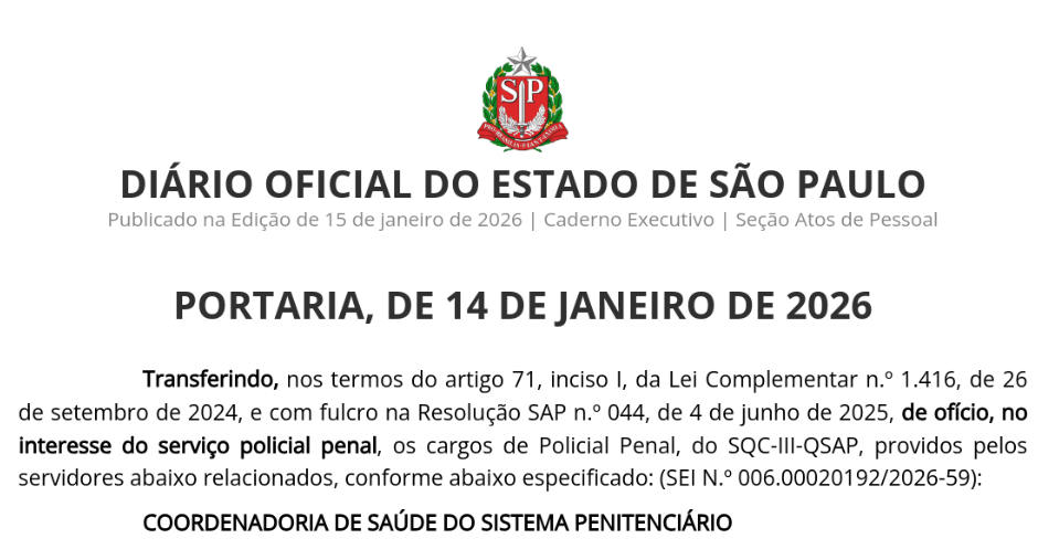 A lista das transferência se encontra nesse link:https://www.doe.sp.gov.br/executivo/secretaria-da-administracao-penitenciaria/portaria-de-14-de-janeiro-de-2026-2026011412972351570771